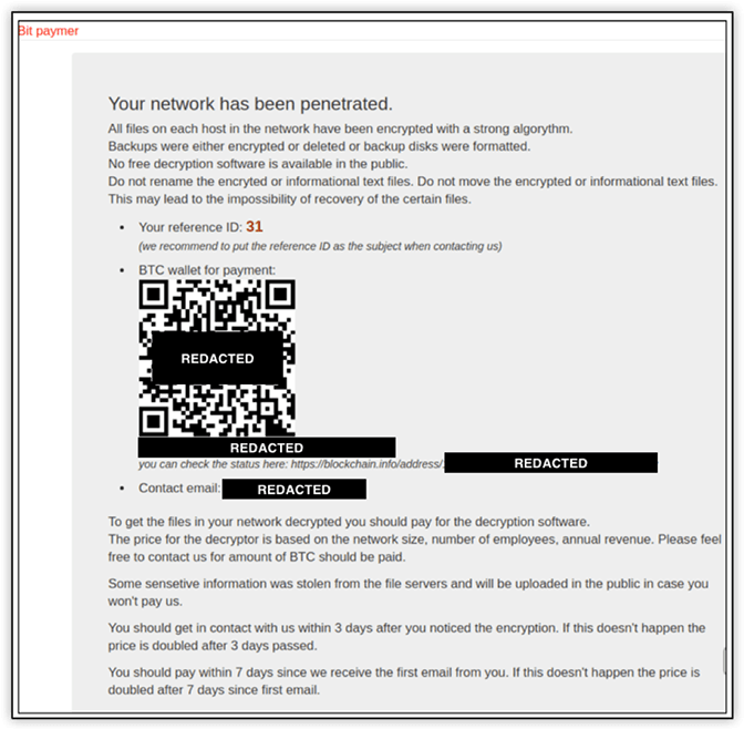 Se incluye un código de referencia, una dirección de pago en Bitcoin (para evitar rastreo) y un correo de contacto.